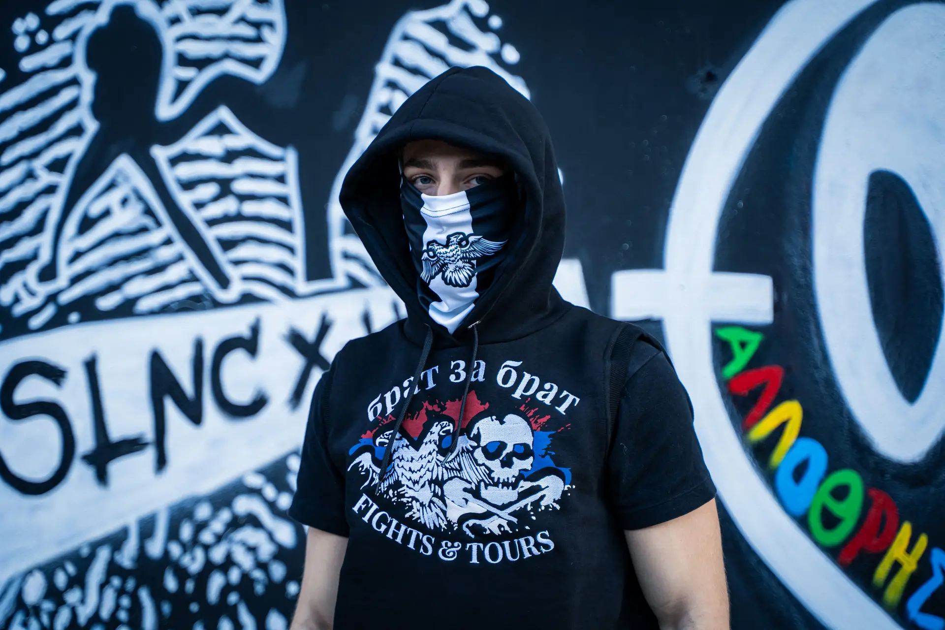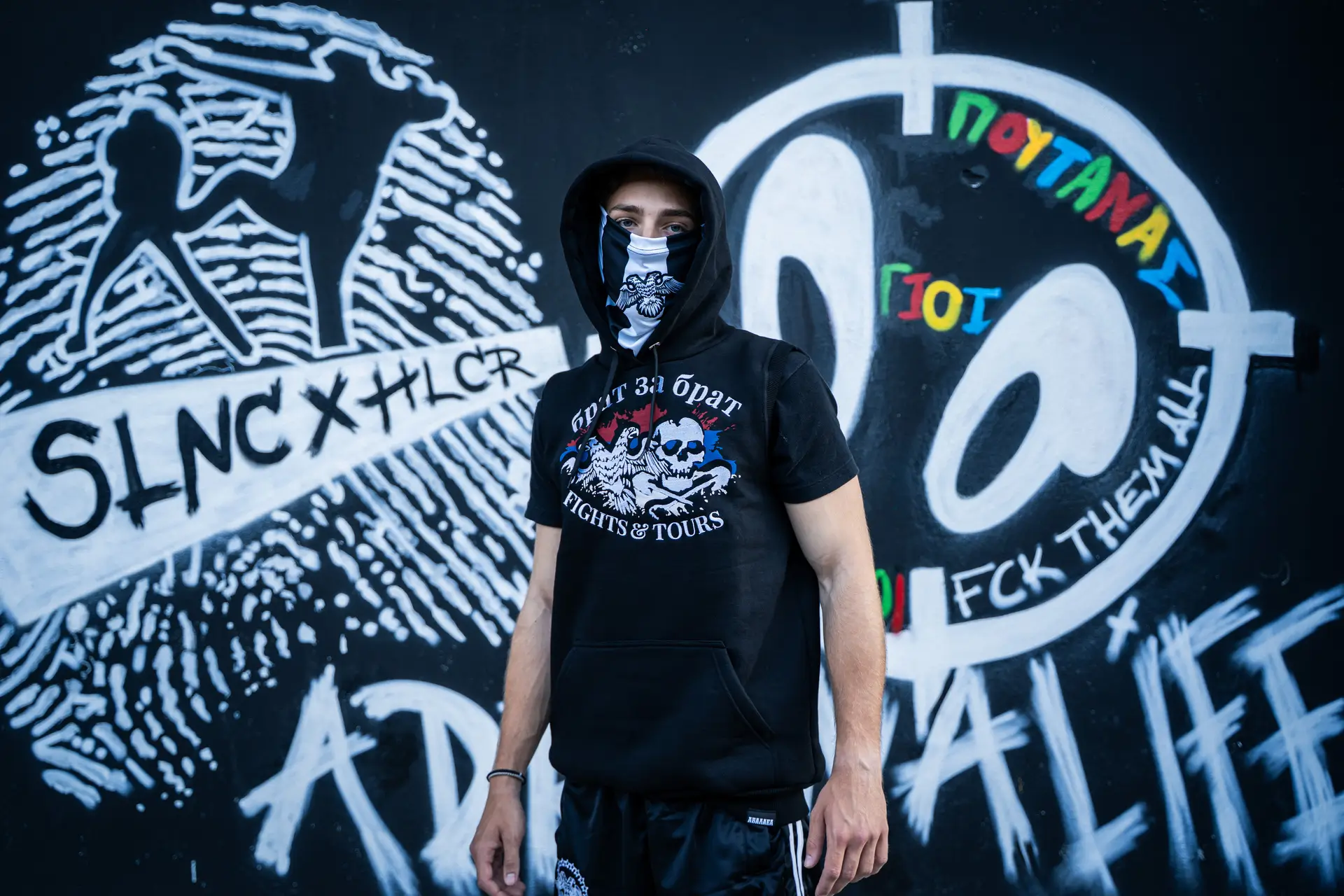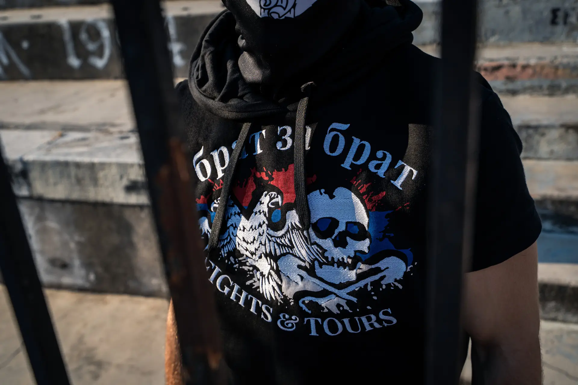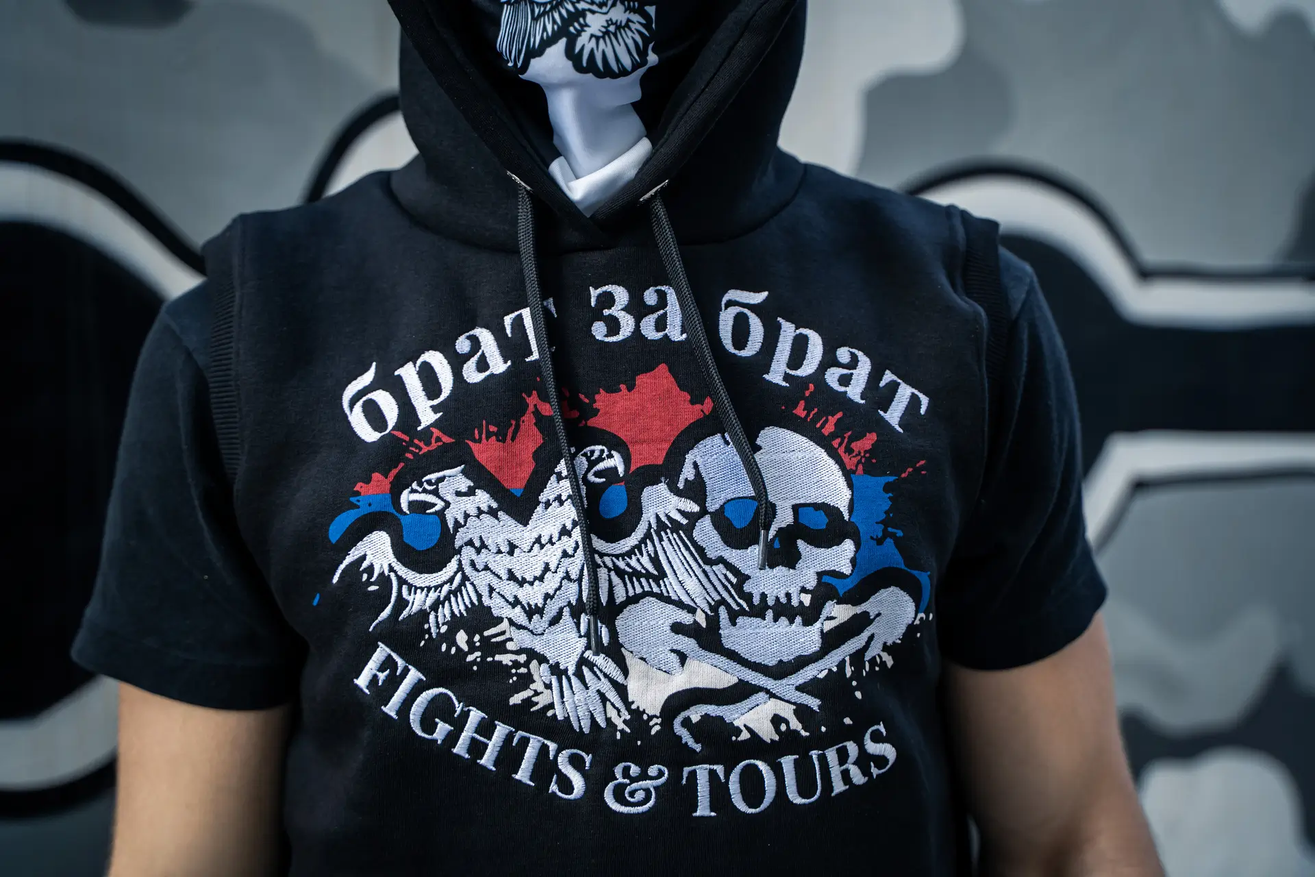 Γυμναστηριακό μαύρο αμάνικο φούτερ με κουκούλα και συνδυασμό στάμπας και κεντήματος. “Брат за братa – Fights & Tours”. Grobari Skull & Abalaea Eagle με φόντο τη Σέρβικη σημαία.